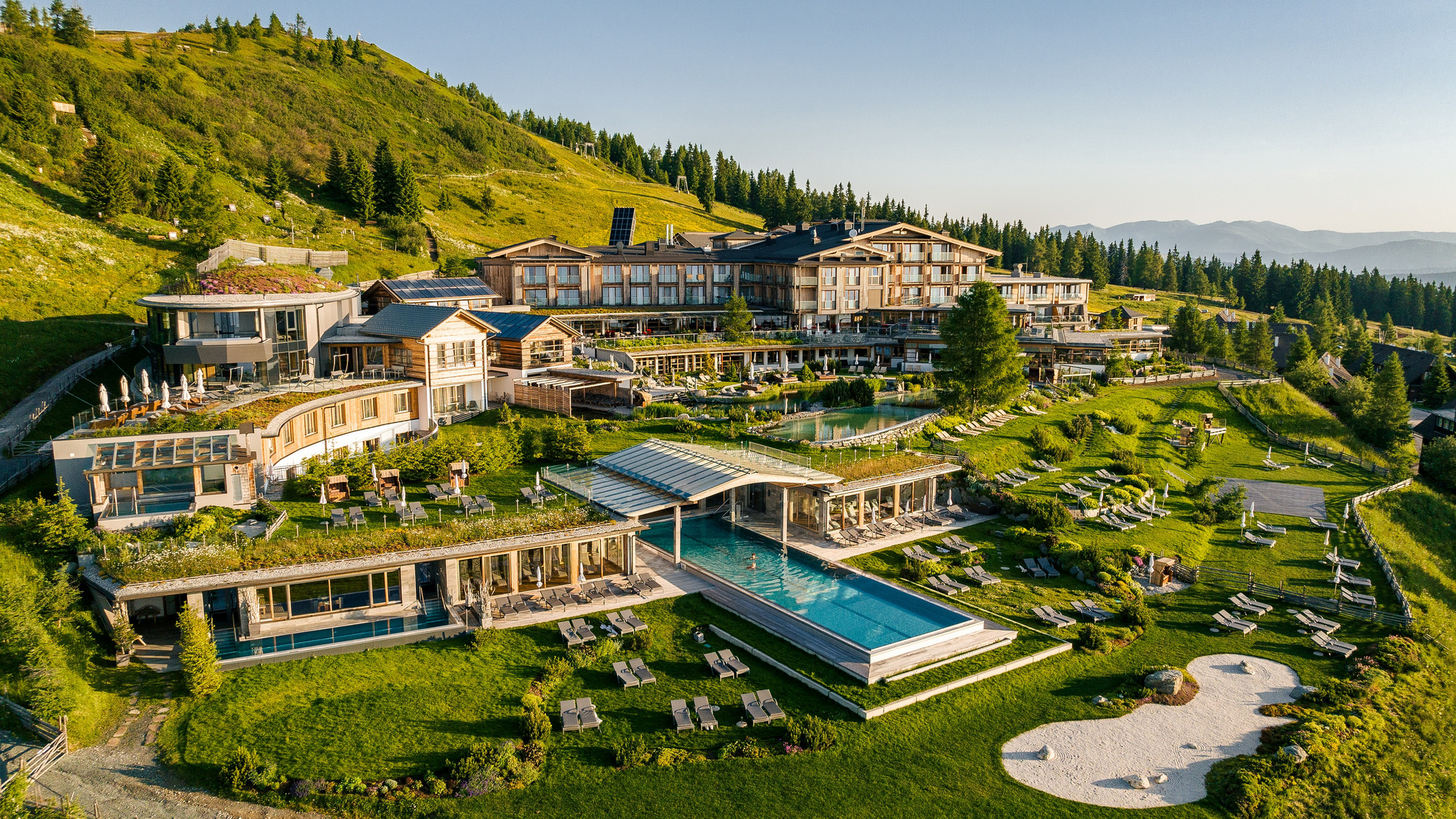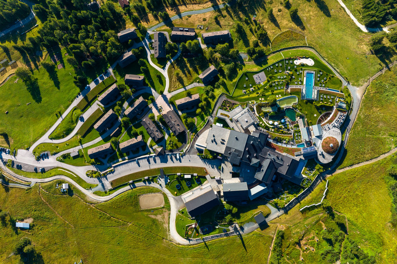Unmittelbar in der Umgebung des Hotels, idyllisch auf dem sanften Plateau der Bergalm gelegen, bieten 14 urige Almhütten mit jeweils vier Suiten inmitten der Natur einen reizvollen Mix aus charmanter Hüttenromantik und dem Komfort gehobener Hotellerie – ein ganz persönliches „Urlaubsreich“ mit gemütlicher Atmosphäre und viel Platz. Sämtliche Angebote des Wellnesshotels stehen auch den Gästen der Chalets zur Verfügung. Der Zugang zum Hotel inklusive aller Einrichtungen wie Rezeption, Restaurant, Bar sowie Bade- und Wohlfühlwelt erfolgt vom Dorfplatz aus über einen geschützten, Bademantelgang mit Tageslicht – nur zwei bis vier Gehminuten von den Chalet-Suiten entfernt.